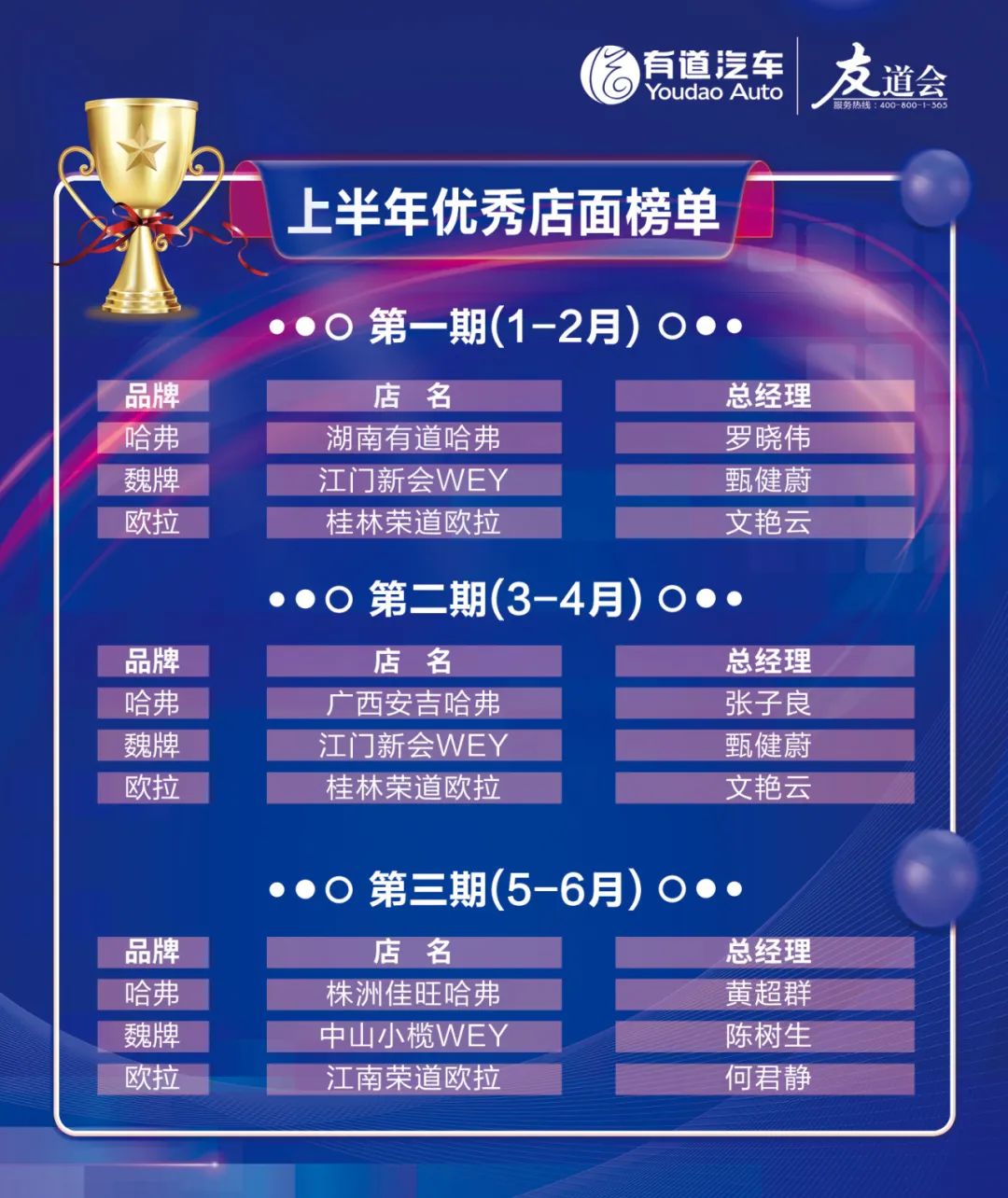 一分耕耘一分收獲,晚宴到了頒獎(jiǎng)環(huán)節(jié),為有道集團(tuán)2023年上半年運(yùn)營(yíng)工作突出門店給予表彰,獲獎(jiǎng)店面名單如下: