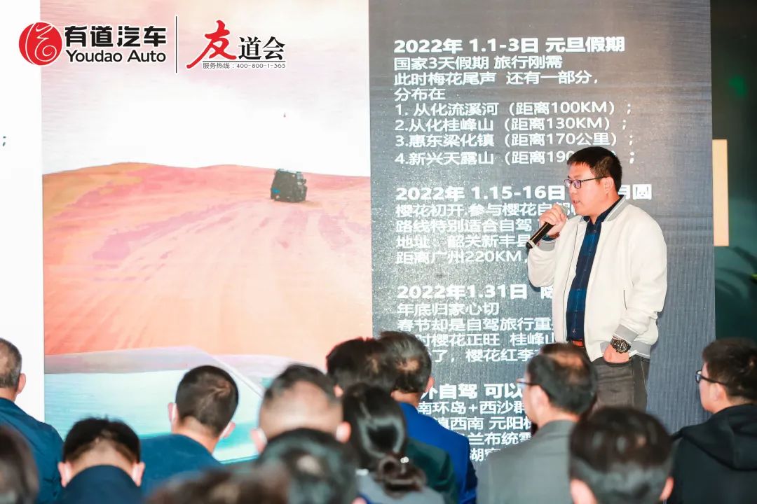 廣東大粵國際旅行社旅游經(jīng)理人/旅行設計師李建先生上臺分享與有道汽車集團的合作項目。