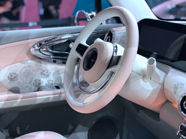 粉白皮質(zhì)雙輻式多功能方向盤,皮質(zhì)座椅之上印有玫瑰花紋,還有以鏤空以及“鉆石”包圍工藝設(shè)計的中央扶手箱,處處透著精致優(yōu)雅氣息。