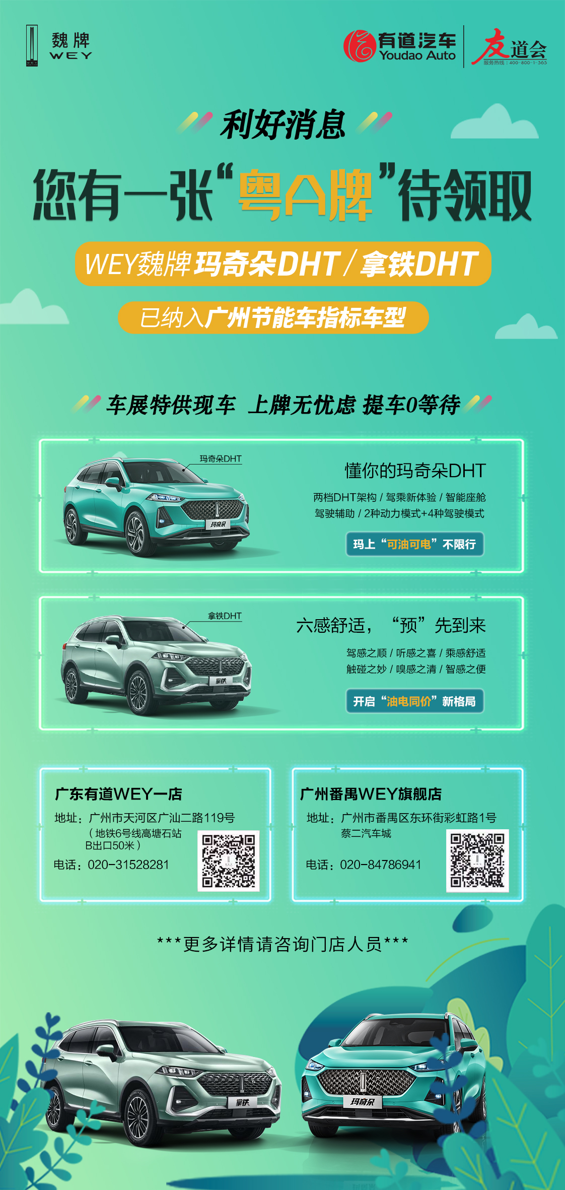 現(xiàn)在到有道WEY購買拿鐵、瑪奇朵兩款混油汽車車型,可以輕松上廣州節(jié)能車牌啦!